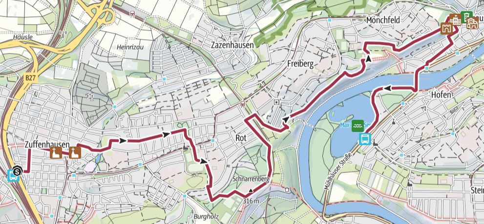 Über diesen Weg gelangt man schließlich nach Stuttgart-Mühlhausen, einem der ältesten Stadtteile der Landeshauptstadt. Mühlhausen blickt auf eine lange Geschichte bis ins Mittelalter zurück. Schon bald erreicht man den Max-Eyth-See, ein beliebtes Naherholungsgebiet, das aus einem ehemaligen Kiesabbau entstand und heute Raum für Spaziergänge, Wasservögel und entspannte Pausen bietet.